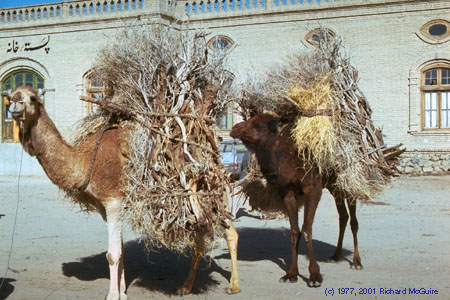 In dry, desert Afghanistan, firewood is at a premium. These camels, standing in front of Kandahar's main post office, are loaded with whatever scraps of fuel wood could be gathered.