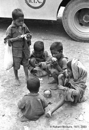 Young street children near Jammu feast on food they've managed to beg from bus passengers. Many Indian children learn to survive on the street at a young age.