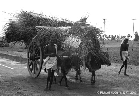 Animal power still provides a major means of transportation for goods and people, like this ox cart hauling palm fronds on a country road between Mahabalipuram and Thirukalkundram in India's southern Tamil Nadu state.