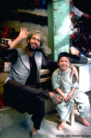 In the Bazaar, Herat, Afghanistan, 1977I often wandered the bazaars of Herat in the early morning and late afternoon when the blazing midday July sun didn't drive me inside. Despite some language problems, I found many Afghans happy to pose for pictures -- the toughest part was getting them to look natural and not wooden when faced with the camera. No such problem with a man and boy at this shoe shop. © 1977, 2002 Richard McGuire |