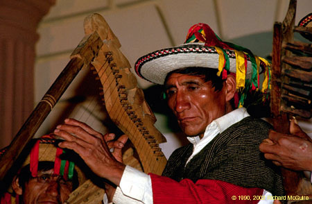 Musician, San Cristóbal de las Casas, Mexico, 1990When I arrived in Chiapas in February 1990, I stumbled upon a celebration of indigenous culture in the main square of San Cristóbal de las Casas. The event brought performers from other regions of Mexico, but indigenous culture is especially rich in Chiapas where many still speak Mayan languages. In fact, Chiapas has more in common with its neighbour, Guatemala, of which it was once part, than with the Mestizo culture of other parts of Mexico. © 1990, 2002 Richard McGuire |