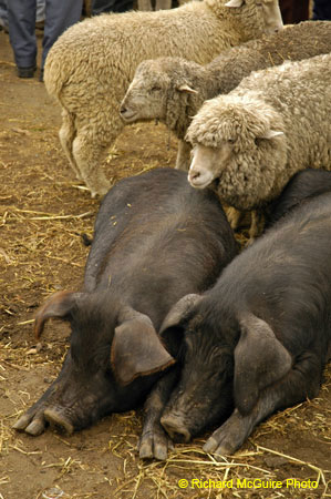 already leaving with pigs or sheep on ropes -- some leading a number of